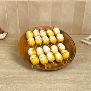 Saffron flavored classic victoria sponge cake stuffed with kinder chocolate. Served in skewers.