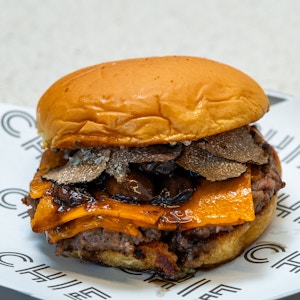 potato bun, cheddar cheese, mushrooms, truffle mayo *Contains: dairy, gluten