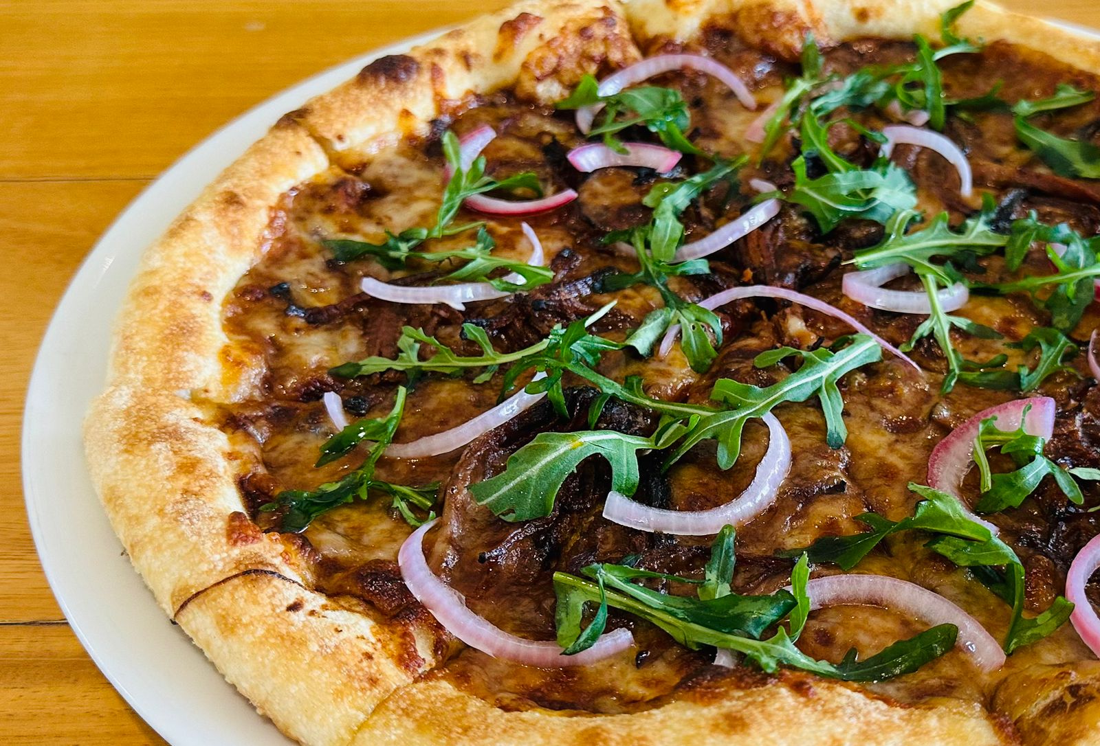 pulled beef brisket, mozzarella cheese, barbeque sauce, tomato sauce Contains: gluten, dairy