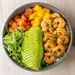 Coconut Rice, Grilled Cajun Shrimp, Mixed Greens, Bacon Bits, Mango, Avocado, Tomato, Spring Onion, Cilantro, Cajun Dressing - Contains Seafood & Spicy | أرز جوز الهند، روبيان مشوي، خس مشكل، بيكون، مانجو، أفوكادو، طماطم، بصل أخضر، كزبرة، صلصة الكاجون - يحتوي على أسماك و الحر - Kcal 678 | Sauce: 92 Kcal per serving (35 ml)
