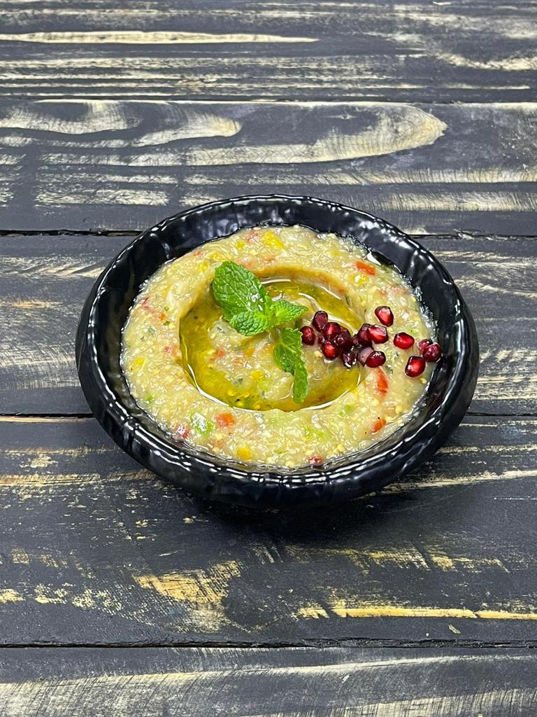 Baba ghanouj: Grilled eggplant with green capsicum, red capsicum, yellow capsicum, parsley, fresh mint, lemon salt, olive oil, pomegranate seed and salt.