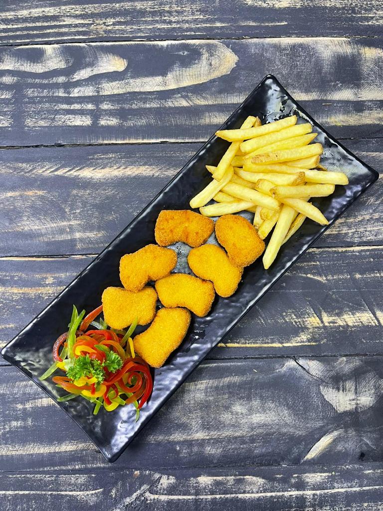 Fried Shrimp: Deep fried shrimp marinated with garlic, black pepper, lemon juice, served with French fries and tartar sauce on the side.
