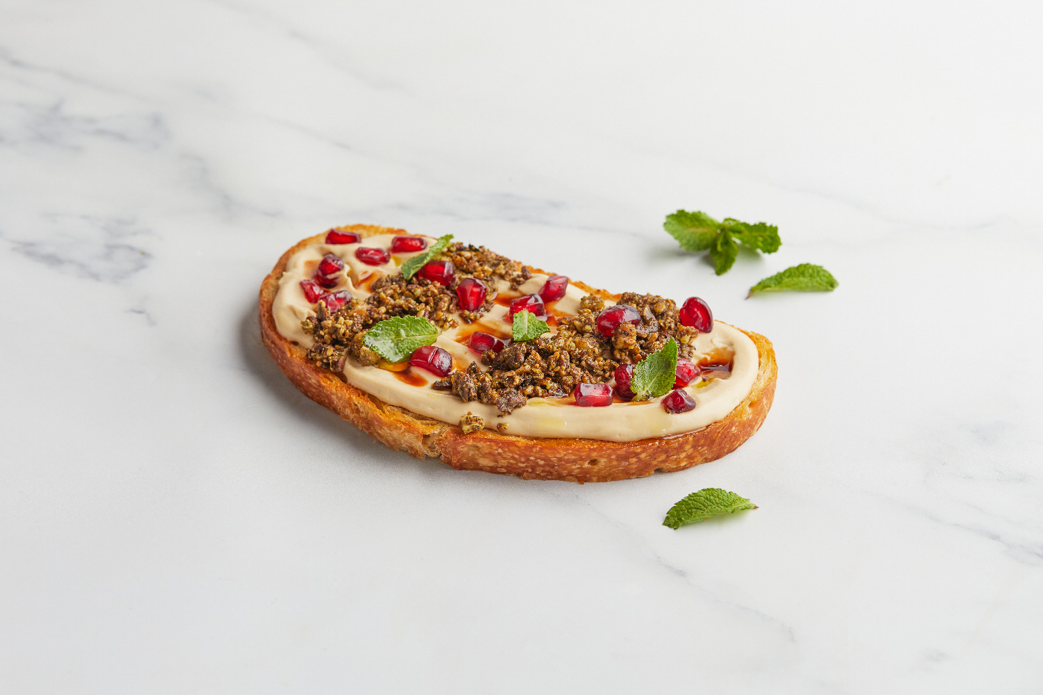 Vegan labneh,pomegranate molasses,pomegranate,walnuts,mint leaves,zaatar chips on sour dough toast - 310KCAL