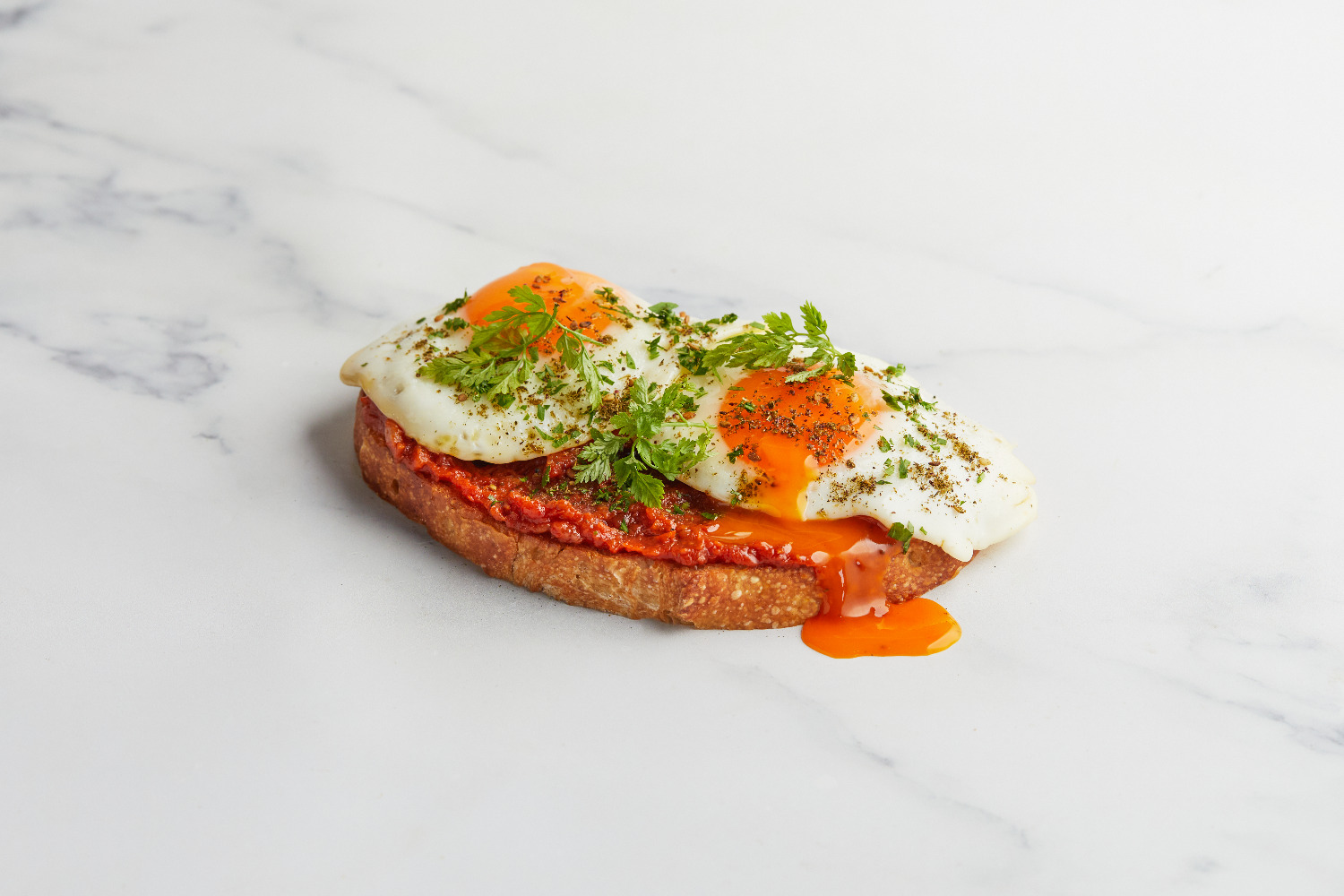 Free-Range eggs, zaatar , Homemade shakshuka sauce , extra virgin olive oil, chervil leaves, parsley on sourdough toast - 309KCAL