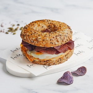 Free-range egg, special sauce, organic cheddar, hot sauce, organic vegetable chips, wholegrain bagel - 360 Kcal