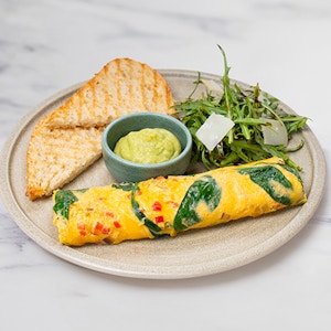 Free range eggs omelette with mixed capsicum, spinach, mushroom, organic cheddar cheese, caramelized onion, mashed avocado & baby arugula served with sourdough bread