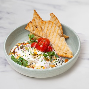 Poached eggs served over dill Greek yogurt with chili olive oil, roasted cherry tomatoes, Affilla cress, good seeds, parsley & walnut