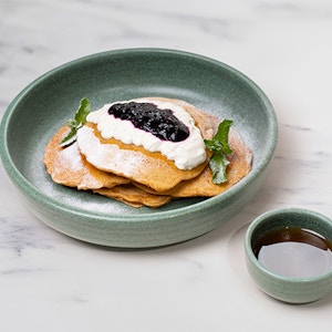 Homestyle oatmeal pancakes topped with vegan butter, wild blueberries compote, vanilla cream & maple syrup