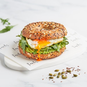 Free-range egg, baby arugula, avocado, pomegranate molasses, balsamic dressing, wholegrain bagel - 260 Kcal