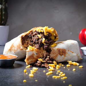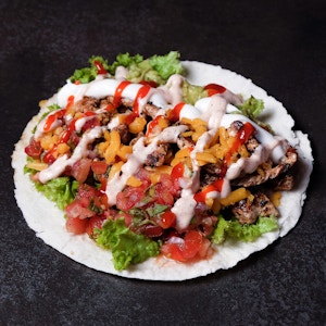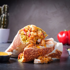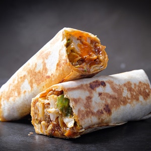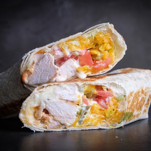 crispy fried chicken, potato crispy, mozzarella cheese, jalapenos, nashville sauce and herbed mayo sauce in a flour tortilla wrap