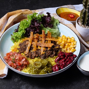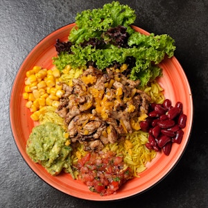 iceberg, avocado, refried beans, corn, cherry tomato, cheddar cheese, bbq sauce, grilled chicken , mexicano sauce, garnished with crispy tortilla