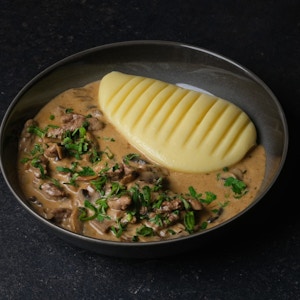 Beef Stroganoff served with jasmine rice or potato puree