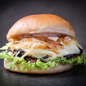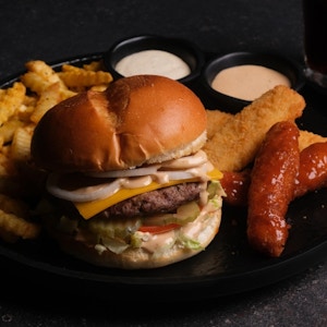 Any Burger of Your Choice, served with two dipped chicken tenders, two mozzarella sticks, crinkled fries, thousand island dip, secret dip, and one soft drink