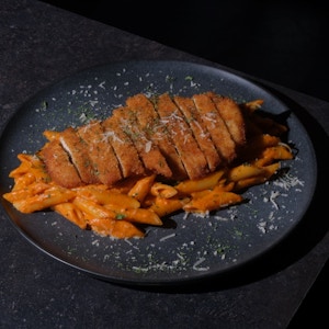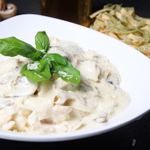 Tagliatelle pasta, fresh mushrooms, parmesan cheese, fresh cream, and basil, topped with panko