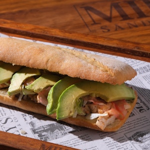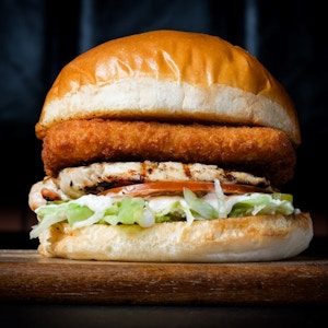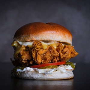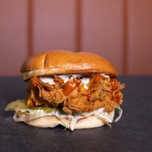 crispy fried chicken topped with American cheese, dill pickles, lettuce, herbed mayo and Nashville hot sauce