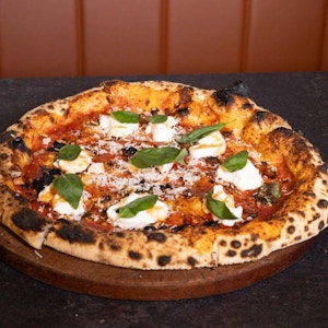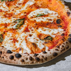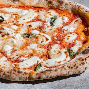 homemade tomato sauce, fresh mozzarella, parmesan, burrata cheese, hot honey, and fresh basil