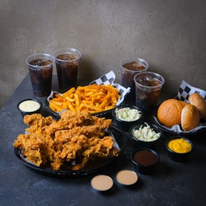 13 Golden Crispy Chicken Strips, Two Large Crinkled Fries, Large Coleslaw, Secret dip, cheddar dip, honey mustard dip, BBQ dip, and four soft drinks