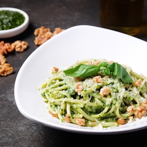 Spaghetti pasta, Creamy pesto, parmesan cheese, fresh basil, and walnuts