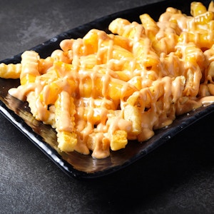 Crinkled fries topped with cheddar cheese, and comeback sauce