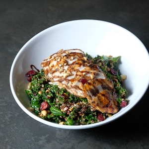 kale, mixed quinoa, cranberries, grilled chicken, crushed peanuts, mixed sesame, and balsamic dressing