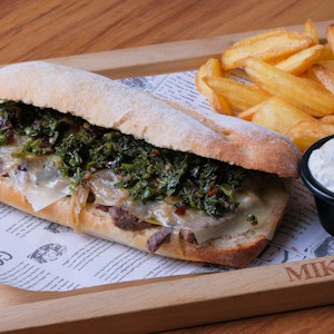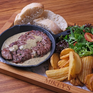 grilled Steak with a side of your choice of imported fries, potato puree or grilled potatoes, sautéed veggies, and your choice of italian butter, dijon cream, mushroom sauce, or pepper sauce