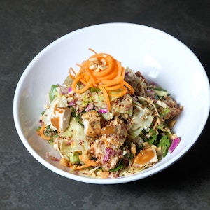 iceberg lettuce, mixed cabbage, mixed greens, quinoa, carrots, toasted peanuts, grilled chicken, and spicy peanut dressing