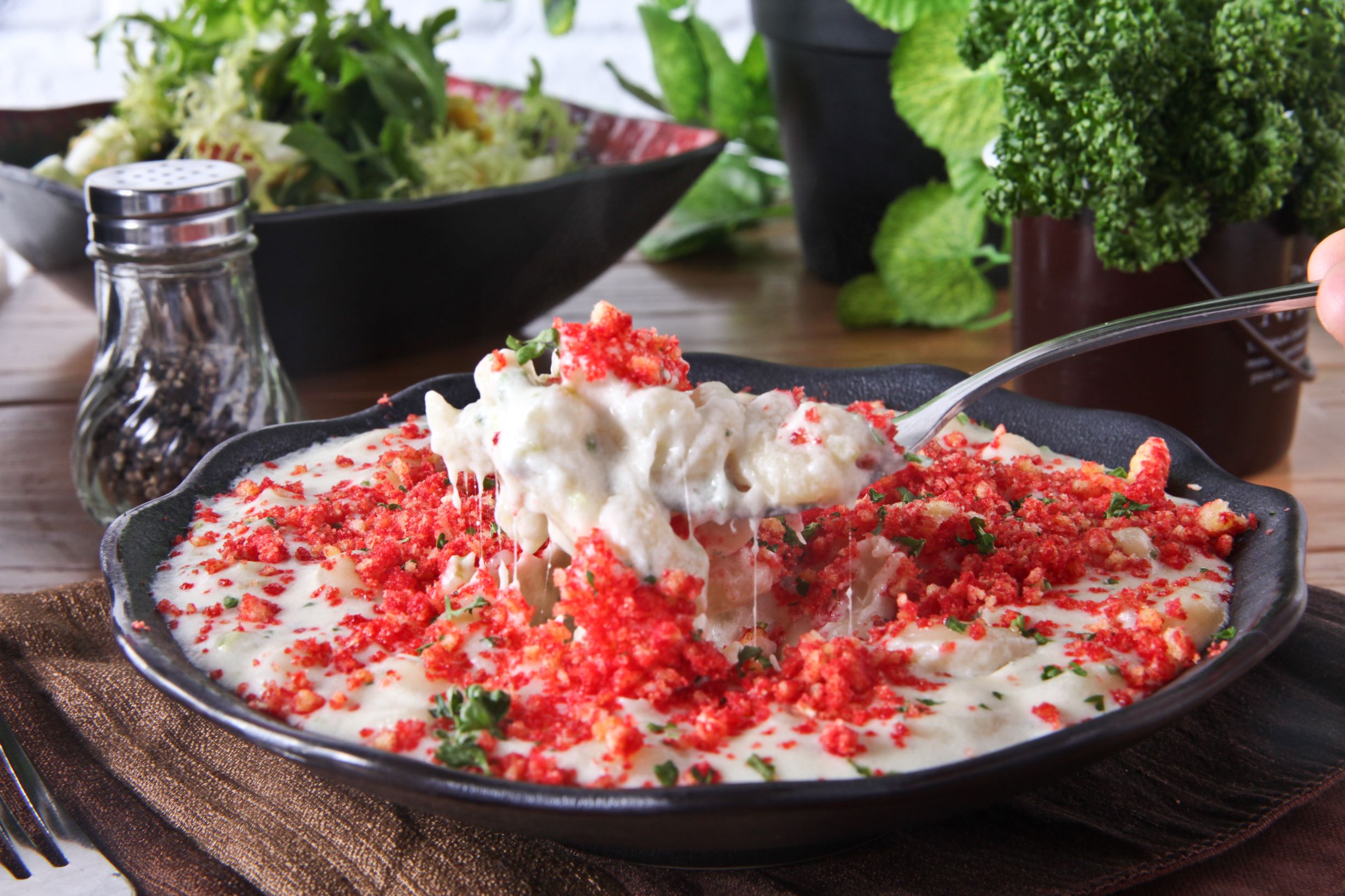 Creamy and Cheesy macaroni pasta serve with cheetos