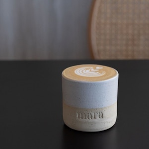 Boiled organic egg and cherry tomato on the top of Turkish labneh. Trickle of chili oil. Served with crispy croissant.