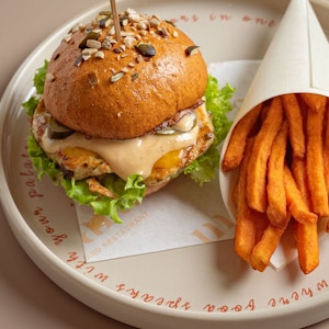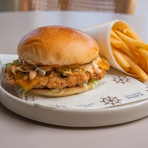 Buttermilk Chicken, dice iceberg lettuce, cheddar & pepper jack cheese, soft fried jalapeno, chimichuri aioli. Betroot bun