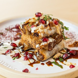 Slow baked chicken cooked with onion, sumac and pinenuts roll in thin palestine bread. Served with tahina, molasses and pomogranate seed.