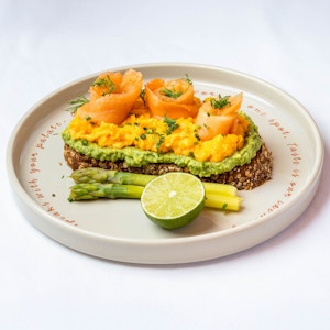 Scrambled organic egg, avocado on multigrain bread with asparagus and smoked salmon. (Allergens: - Fish, egg, gluten)