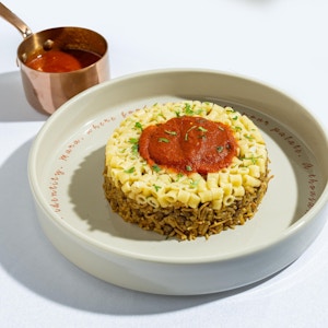 Mini Pizza with Tomato sauce, soft mozzarella cheese , fresh basil, short rib (garnish chopped parsley)