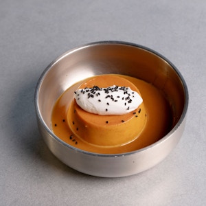 A silky fusion of traditional Aseeda and classic crème caramel on a bed of caramel sauce. Topped with quenelle whipped cream, dusted flaxseeds.