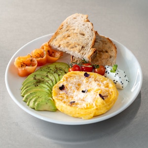 Scrambled egg, smoked salmon, sundried cherry tomato in vine, half avocado, Sakura mix, and whipped yoghurt
