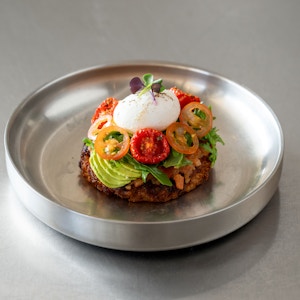 Potato bun, poached egg, tomato salsa, avocado, confit cherry tomato, fresh cherry tomato, rocket leaves, Sakura mix
