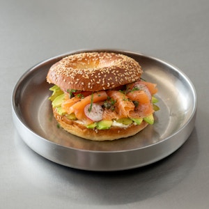 Bagel, labneh and Dijon mix, smoked salmon, pickled cucumber, fresh dill, red radish, capers, hass avocado, chives