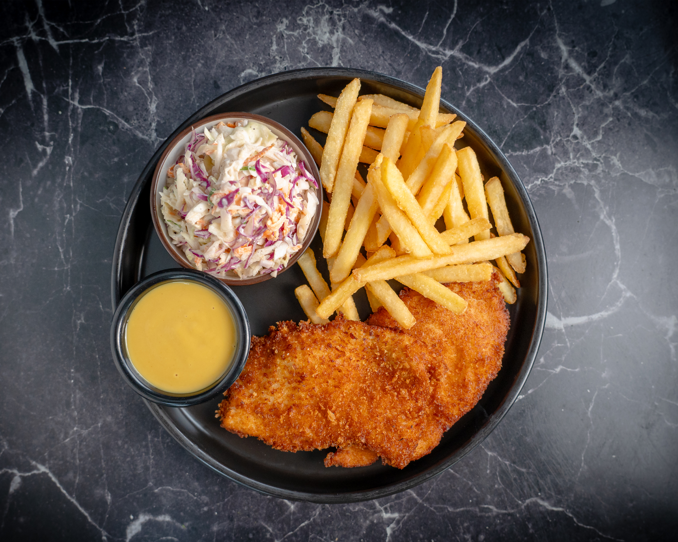 Hormones free Char-Grilled chicken breast served with fries and Japanese coleslaw.