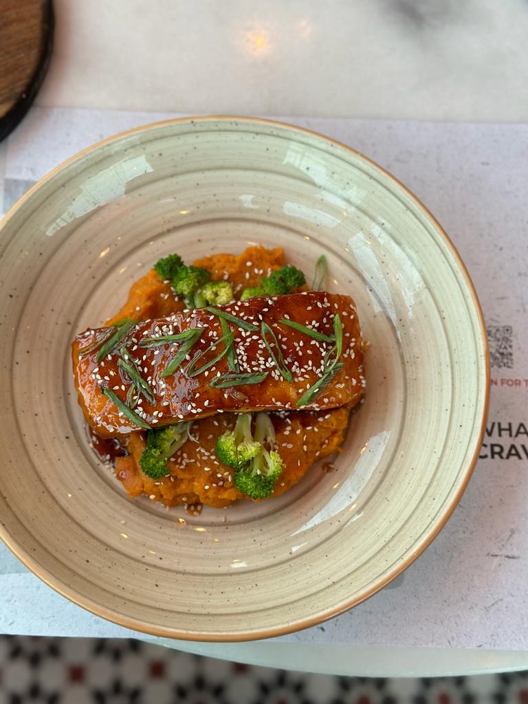 with roasted squash and our special honey mustard sauce. 658 calories - مع اليقطين المشوي وصلصة العسل والخردل الخاصة