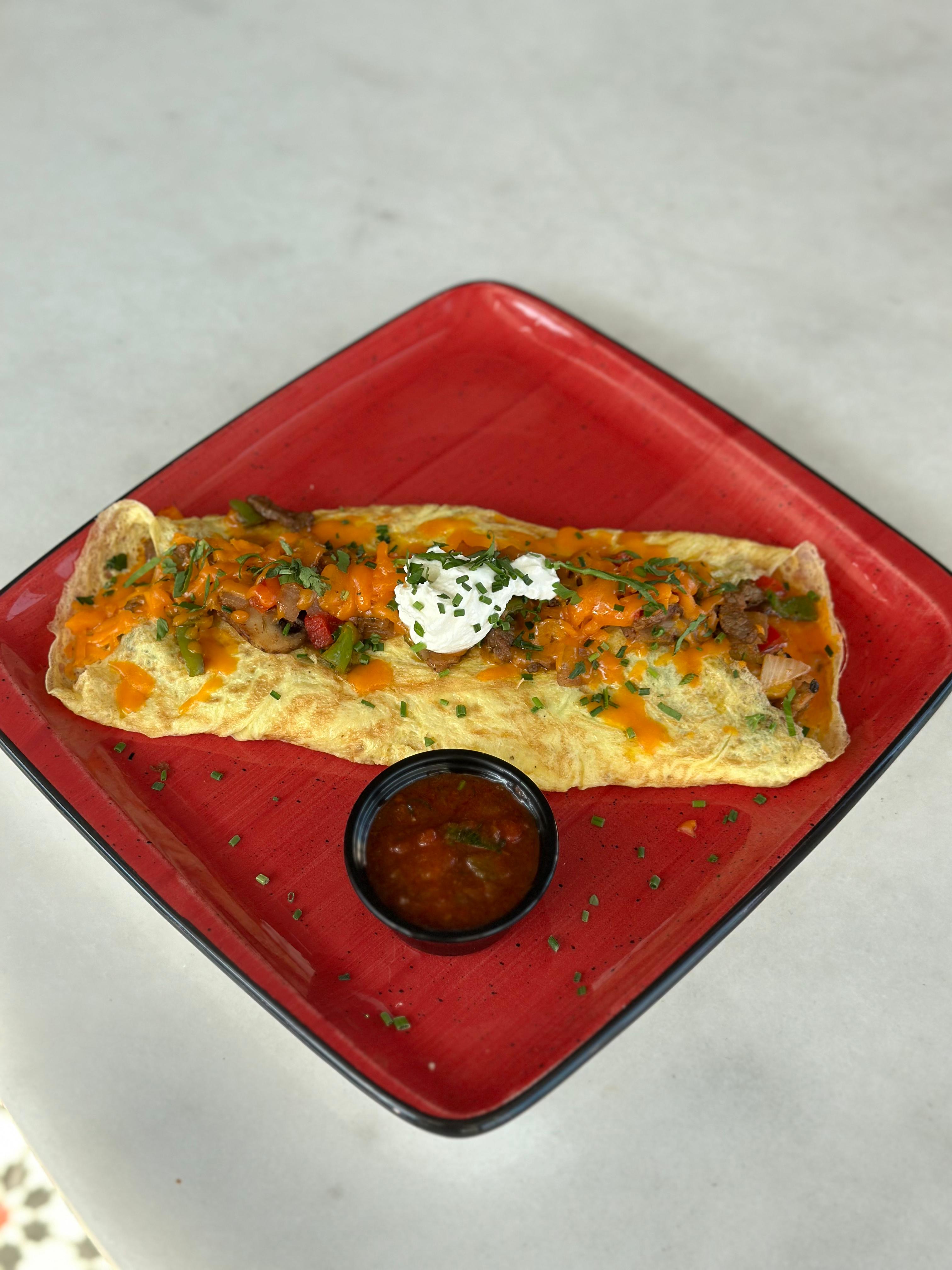 Chicken fajita omelette Chicken breast seasoned and grilled with vegetables then rolled in fresh made omelette - (calorie 670) اومليت دجاج فاهيتا اومليت محشو بدجاج فاهيتا المشوي مع الخضار