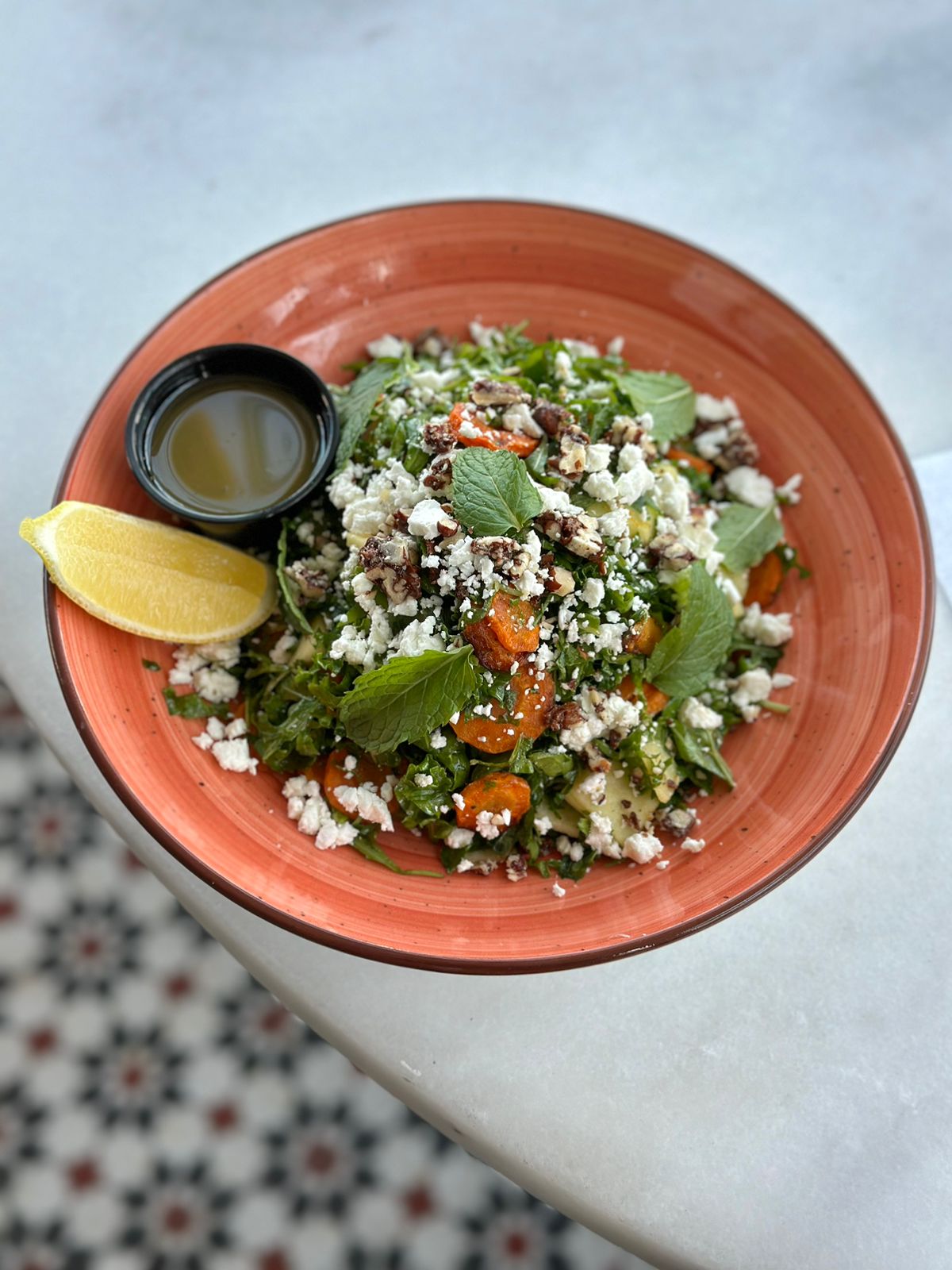 Mix of kale, baby rocca, sweet potato, carrots, and green apple topped with caramelized pecans and goat cheese and served with lemon honey sauce - (Calorie 571) مزيج من الكايل والجرجير مع البطاطا الحلوة والجزر والتفاح الأخضر ويقدم معها البيكان المكرمل وجبنة الماعز مع صوص العسل والحامض
