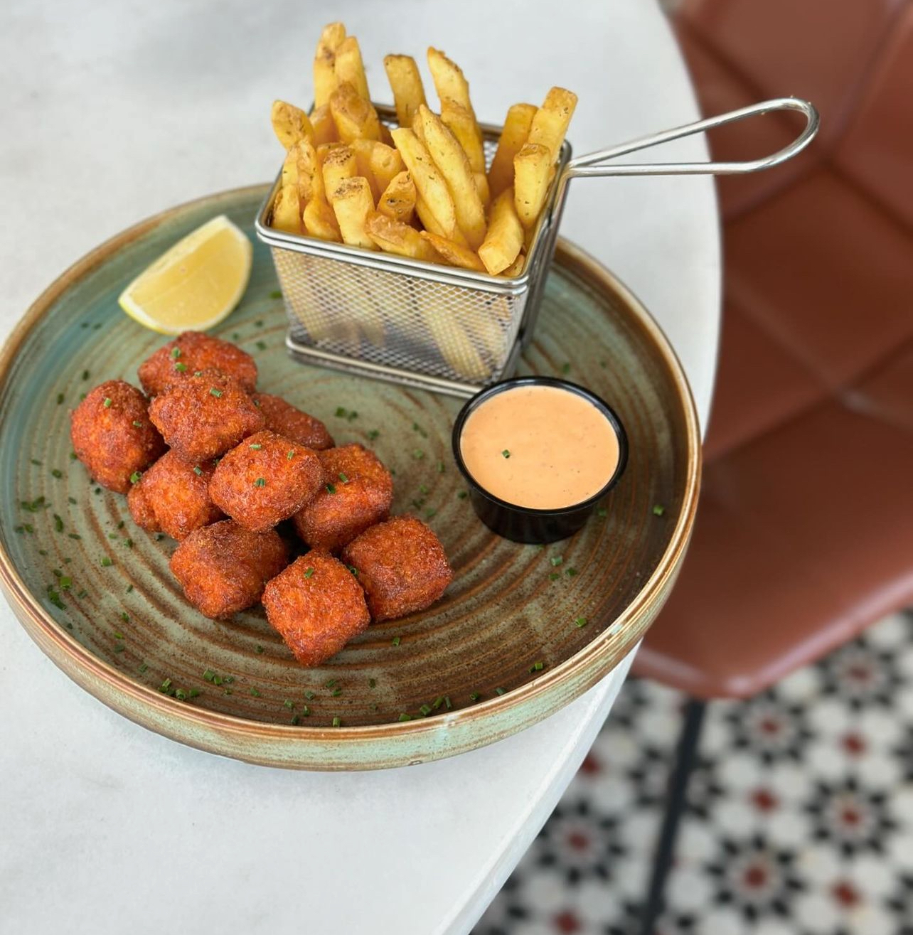 Crunchy salmon bites served with chili sauce and fries - Calories 726 - قطع السلمون المقرمش ويقدم معه صوص وبطاطس